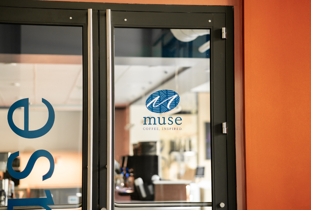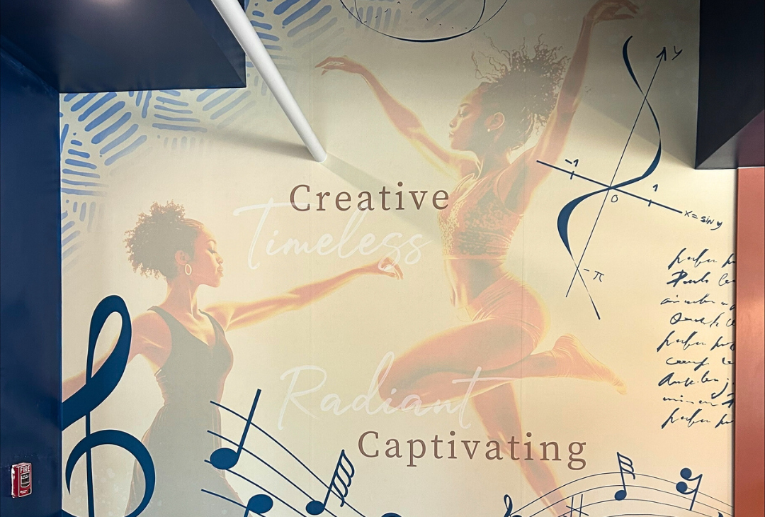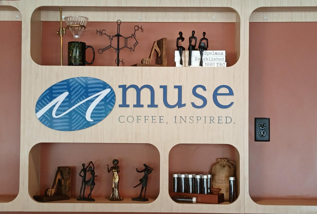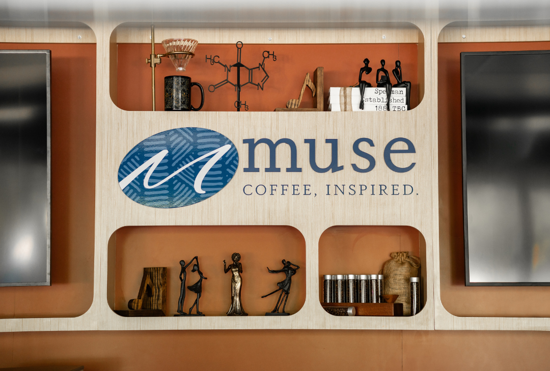 The branding direction for Muse Café was inspired by a fusion of chemistry, science, and dance, rendered in a distinctive art style that celebrates movement, intellect, and creativity. SCOPOS developed a cohesive visual identity using Spelman’s signature blues and layered graphic elements across multiple surfaces. Matte vinyl wall graphics span key areas such as the entrance wall, Teabot corner, and market wall, creating immersive storytelling moments. Dimensional signage and counter millwork further reinforce the brand, turning the café into a cultural landmark that invites curiosity and connection.