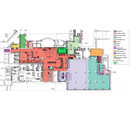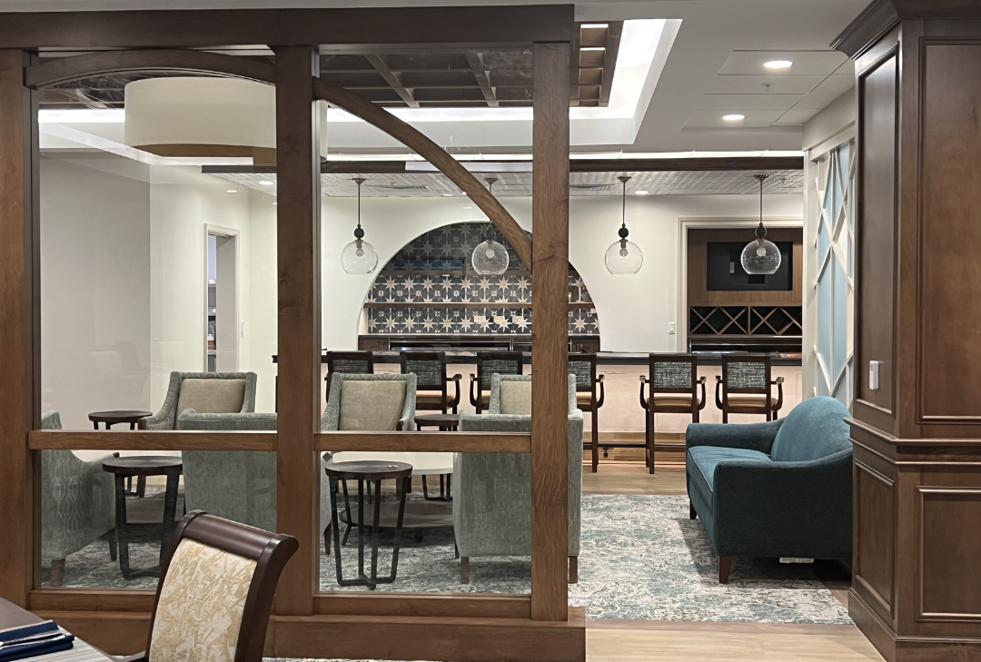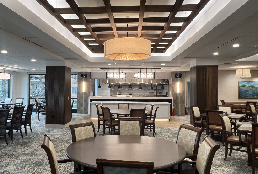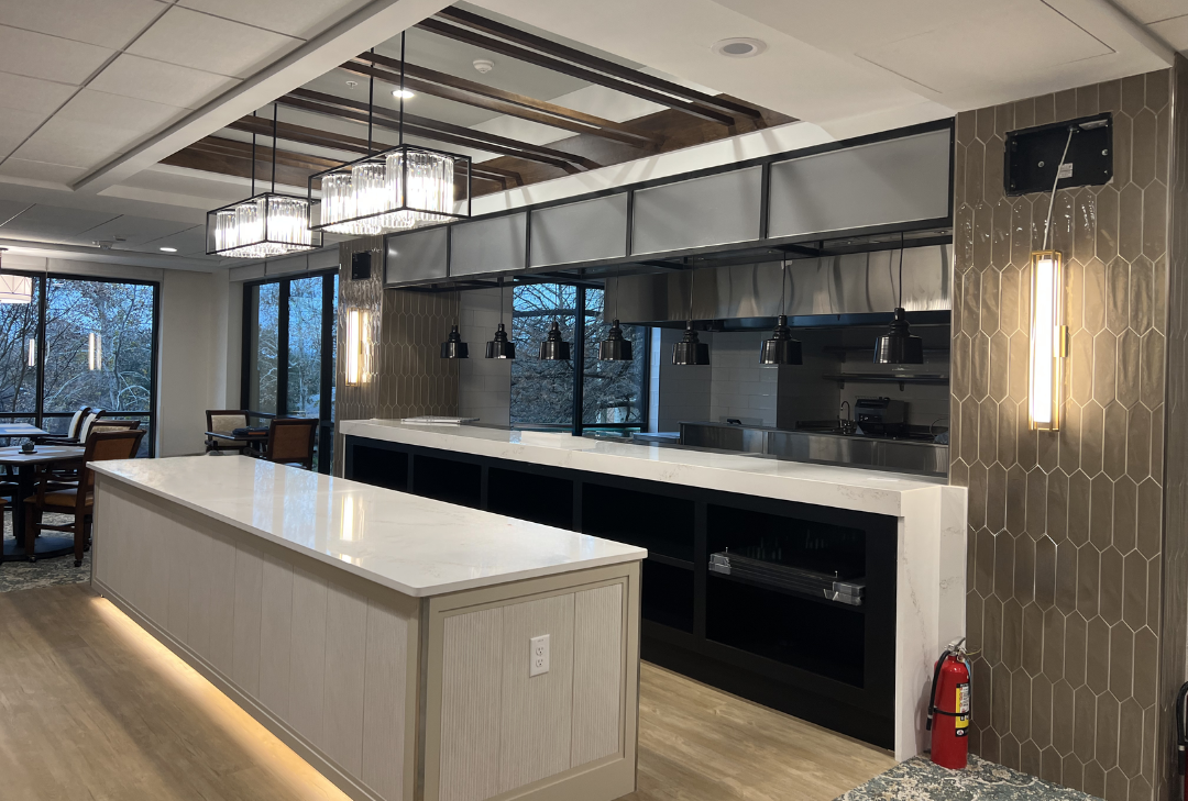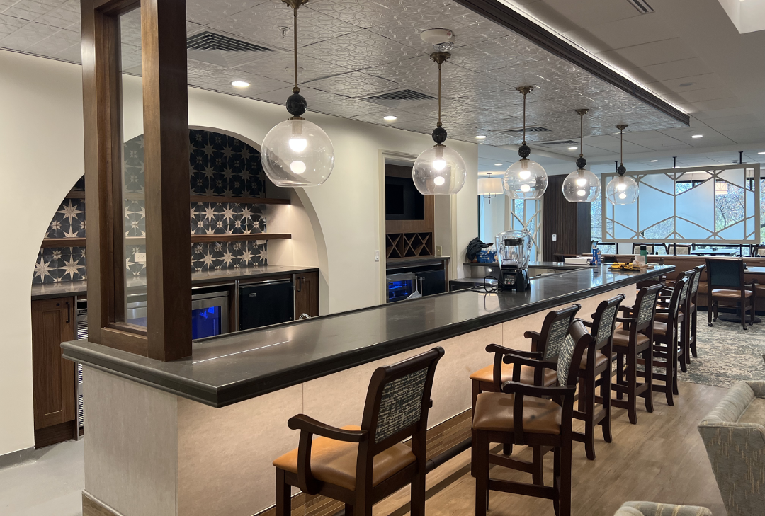 At Army Residence Community in San Antonio, TX, the Commons area was transformed into a vibrant hub for dining and social connection. The renovation introduced a full-service expo restaurant, a flexible bar, a market, and a private dining room, all supported by a completely rebuilt main production kitchen designed for improved flow, variety, and efficiency. A second kitchen was added to the Sky Lounge on the top floor, bringing elevated culinary service to this premier amenity space, while a new back kitchen was created to stage food service for the renovated auditorium, eliminating the need for a separate serving kitchen in the performing arts venue. Together, these upgrades provide residents with a seamless and enhanced dining experience, offering both choice and convenience while supporting operational excellence behind the scenes.