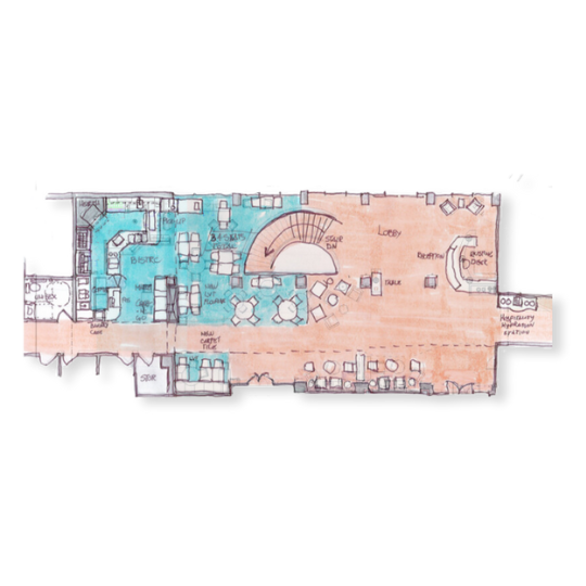 In revitalizing the transitional space, the goal was to infuse purpose and definition. Together, varied floor patterns and furniture arrangements create intimate areas within the new, open floor plan. The lobby and bistro have become an elegant destination for gathering, dining and socializing.