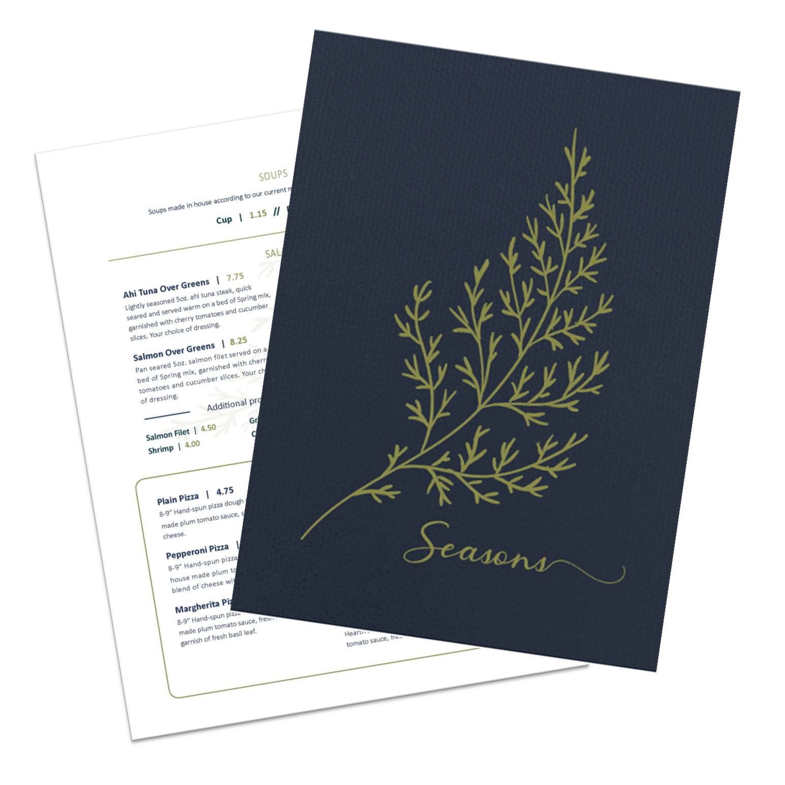 We began the process of building the brand for Pennswood by collaborating with Culinesse to gain the vision they had for their overall food service. In their casual everyday bistro, we chose easy, durable melamine that coordinated with the interior design, matched with interesting hearth oven-ready pieces, a pop of color with a comfortable ceramic coffee mug, and playful cloth bistro napkins! Going along with the everyday casual, we crafted a simple but fun Seasons logo, as well as menu covers with edible menu templates that were both displayed on their digital menu boards and the traditional table menus. The flex bar experience warranted a fun and organic selection of tapas-style stoneware in soft, muted, modern hues, with fun servers, board styles, and eclectic barware for fun mix-and-match tapas and complete bar service.